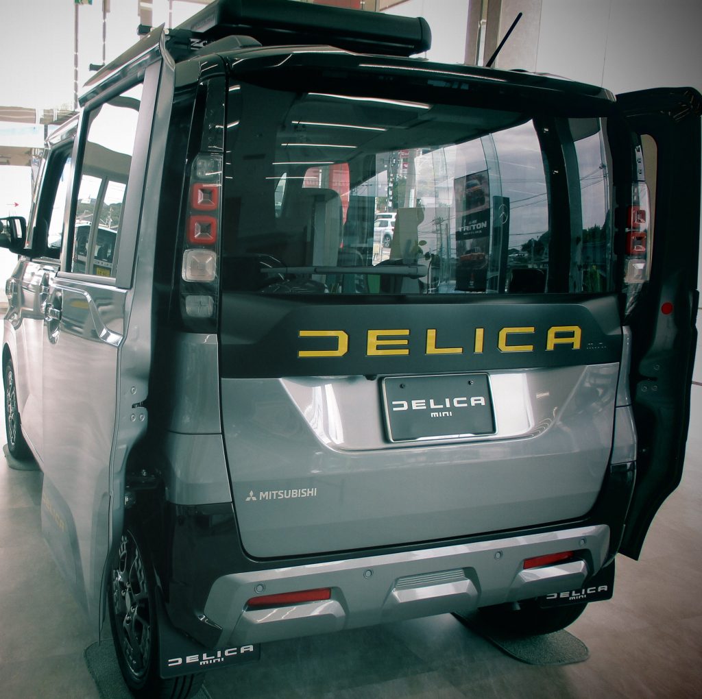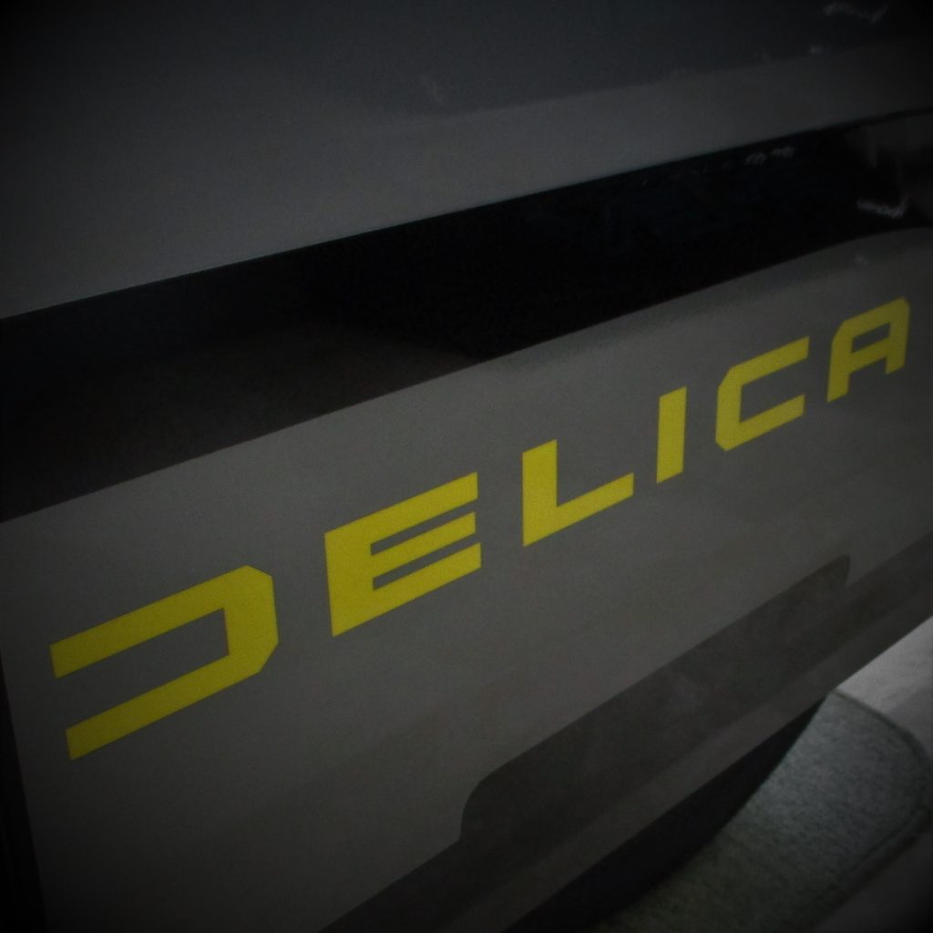 チタニウムグレーメタリックの車体に、イエローエンブレム、ドアミラーカバー、サイドに黄色いデリカのロゴなど、たくさんのオプション付きで、