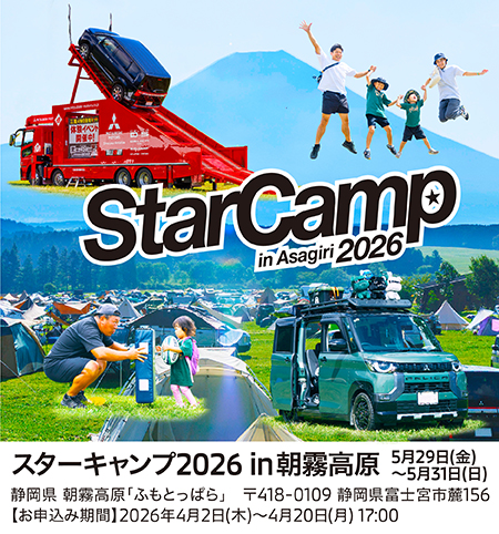 三菱自動車工業株式会社(以下三菱自動車)は、オートキャンプイベント「スターキャンプ2026 in 朝霧高原」を5月29日(金)~31日(日)に、朝霧高原「ふもとっぱら」(静岡県富士宮市)にて開催することを決定し、本日4月2日(木)よりスターキャンプ専用WEBサイトにて、参加者の募集*を開始します。